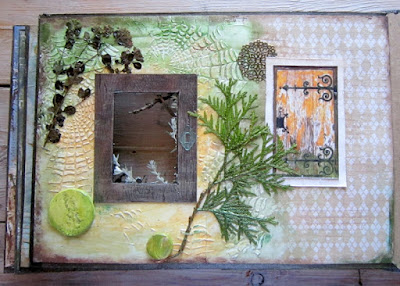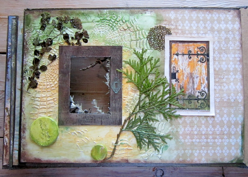 21х30, на основе из толстого картона, с обилием фактур и текстур на скраповой и акварельной бумаге. С гербарием, ветками, с самодельными фишками с отпечатками растений, с проволокой и кожей. Всего на 12 фотографий, но оно того стоит. Теперь бы придумать и осуществить фотосессию на фоне старых дверей, заборов, калиток.Делала на курсе Юлии Родионовой. Получила тонну удовольствия!